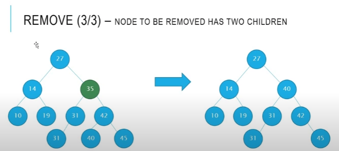 27보다는 크니까 오른쪽 => 35보다는 작아서 왼쪽 => 부모를 죽이고 자식을 할아버지에게 직접 붙여주면 됨. (31을 지우고 자식 노드인 30을 35에 붙여준다.)