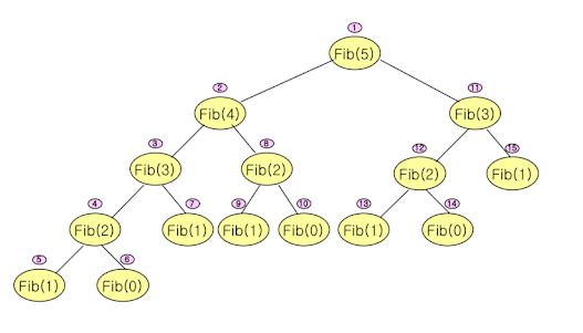 위 그림을 보면 Fib(5)를 구하기 위해서 Fib(1)이 5번 / Fib(2)가 3번 호출되었다.