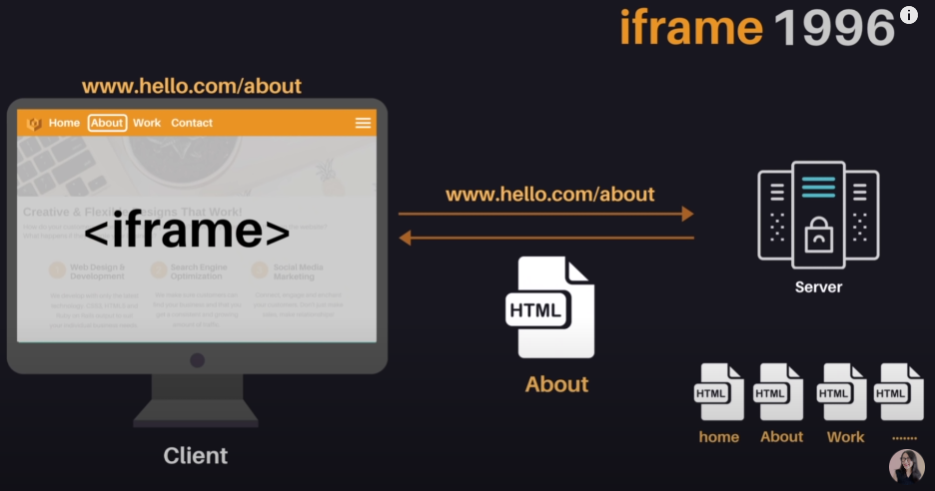 1996년, 문서 내에서 또 다른 문서를 담을 수 있는 iframe태그가 도입이 되었고, 이제는 페이지 내에서 부분적으로 문서를 받아와서 업데이트할수 있게 되었다.