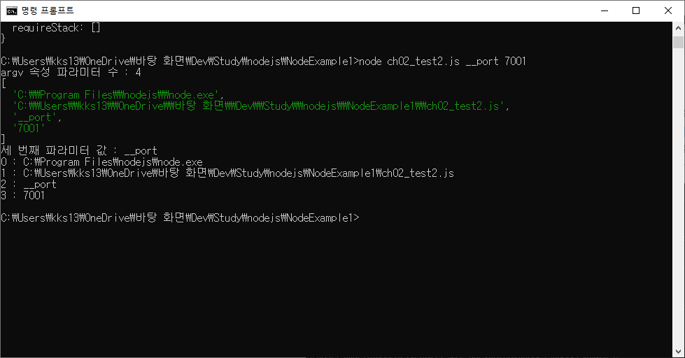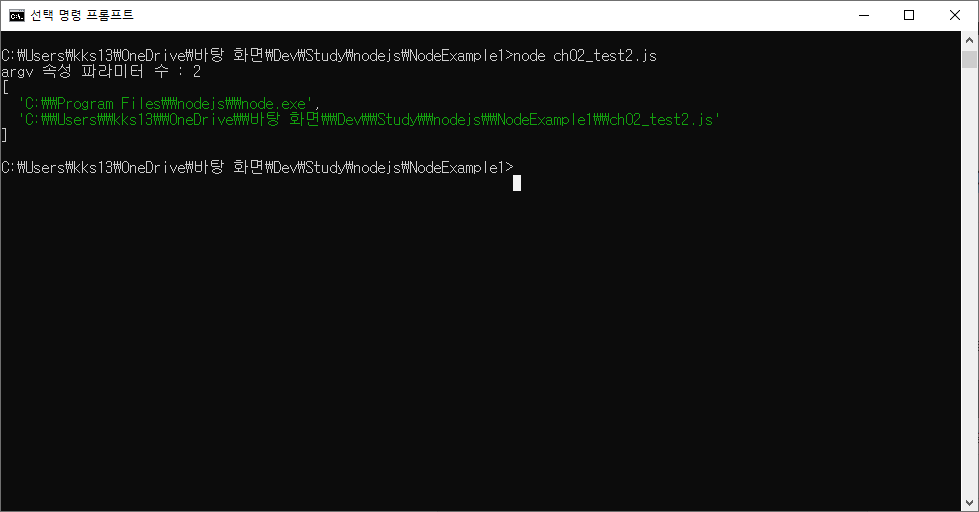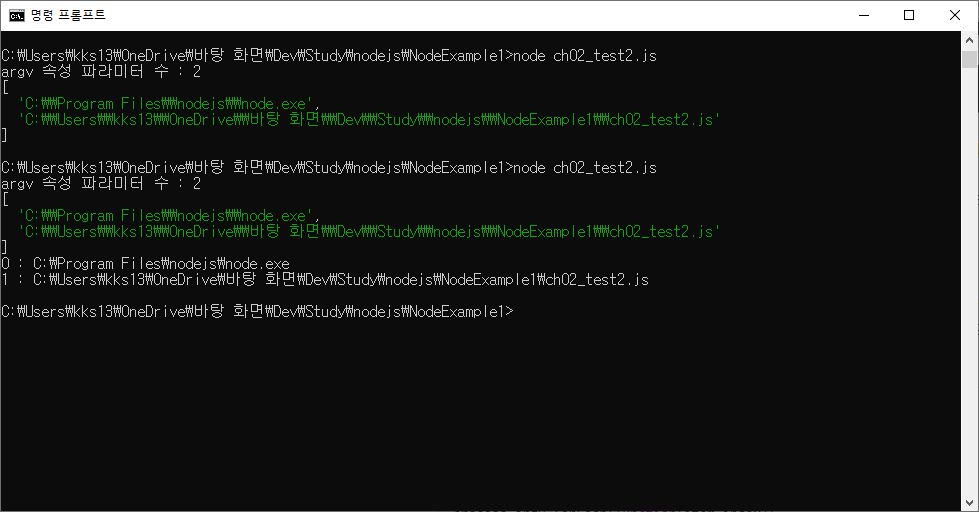 자바스크립트 파일을 실행하기 위해 사용한 node.exe 파일의 이름이 첫 번째 파라미터가 되고 자바스크립트 파일의 패스가 두 번째 파라미터가 된다.