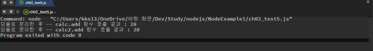이렇게 만든 ch02_test5.js 파일은 메인 파일이며, calc.js 모듈 파일을 불러와서 사용할 수 있다.