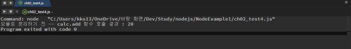 console.log('모듈로 분리한 후 -- calc2.add 함수 호출 결과 : %s',calc2.add(10,10));