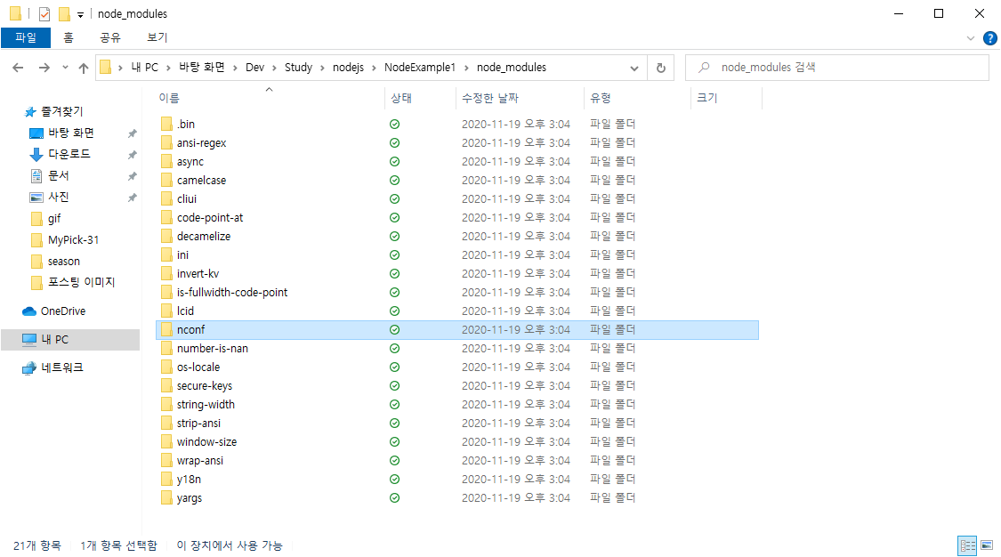 명령 프롬프트를 열고 nodejs 폴더 안에 있는 NodeExample1 폴더로 이동한 후, nconf 패키지를 설치한다.