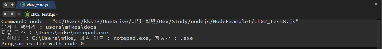 console.log('디렉터리 : %s, 파일 이름 : %s, 확장자 : %s', dirname, basename, extname);