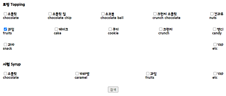 이를 필터링해보기 위해서 base 에 과일 / topping 에 과일을 골라보면