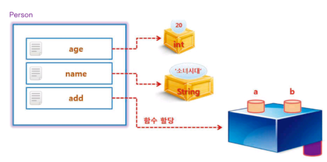 즉, 객체의 속성에는 변수를 만들어 할당할 수 있으므로 객체 안의 속성에 함수를 할당할 수 있다. 객체의 속성으로 더하기 함수를 할당했을 때를 표현한 그림이다.