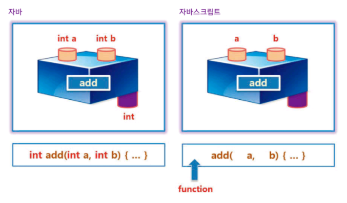 자바스크립트가 자료형을 표시하지 않기 때문에 함수를 선언하고 호출하는 형태도 살짝 달라진다.