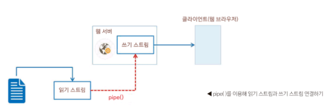 지금은 파일에서 만든 스트림 객체와 웹 서버의 스트림 객체를 pipe() 메소드로 연결할 수 있다는 것만 이해하면 된다.