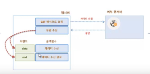 다른 서버로부터 응답을 받을 때는 data 이벤트가 발생한다. 수신 데이터의 용량에 따라서 data 이벤트는 한 번 또는 여러 번 발생할 수 있다.