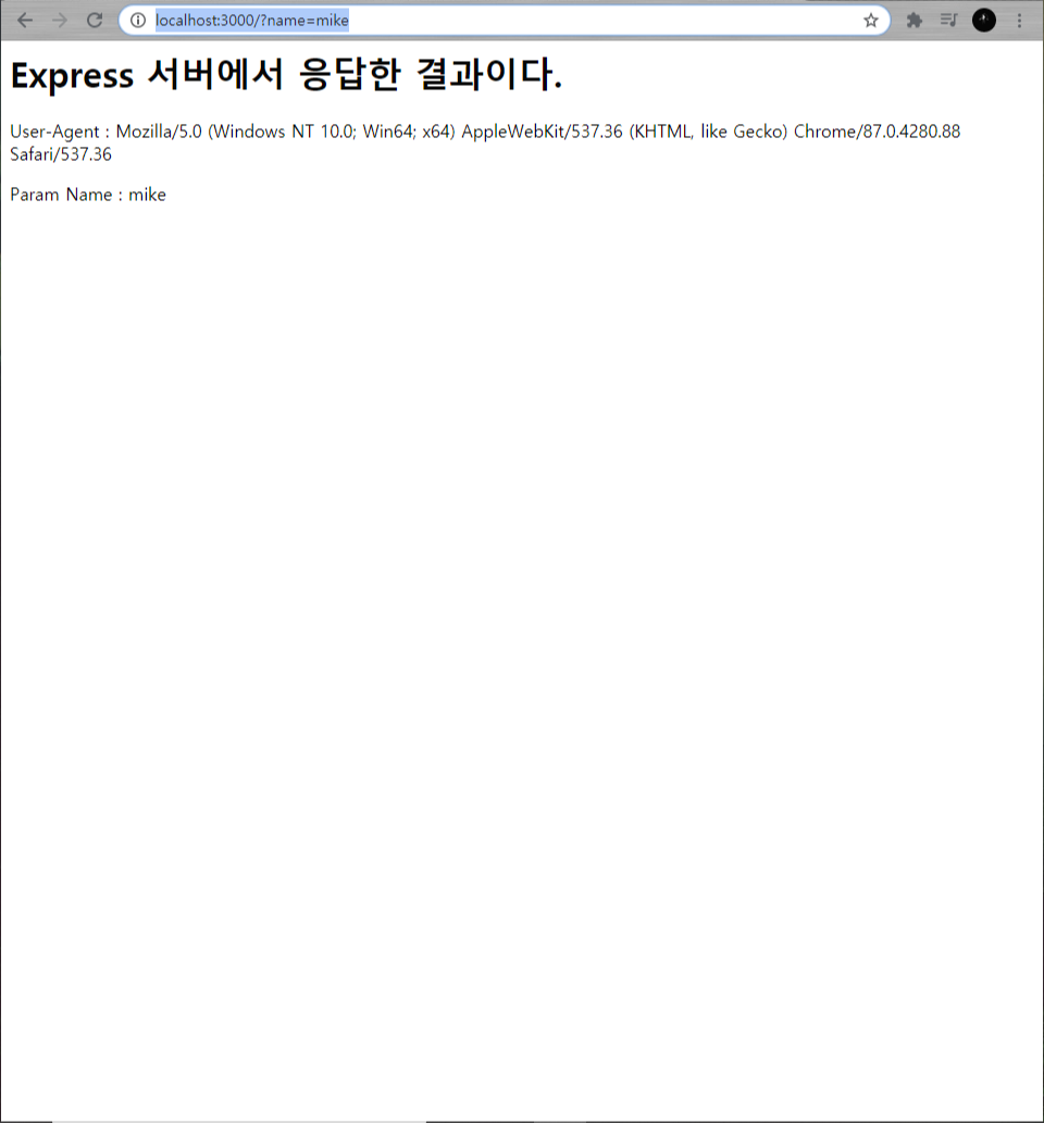예를 들어, http://localhost:3000/?name=mike 와 같은 주소로 접속한 경우, 요청 파라미터인 name 의 값은 다음 코로 확인할 수 있다.