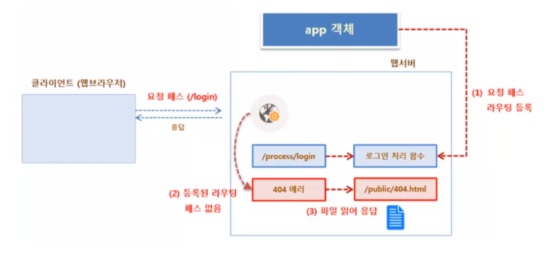 웹 브라우저에서 요청한 패스가 라우터에 등록한 함수 중에 없다면 404 오류가 발생한다.