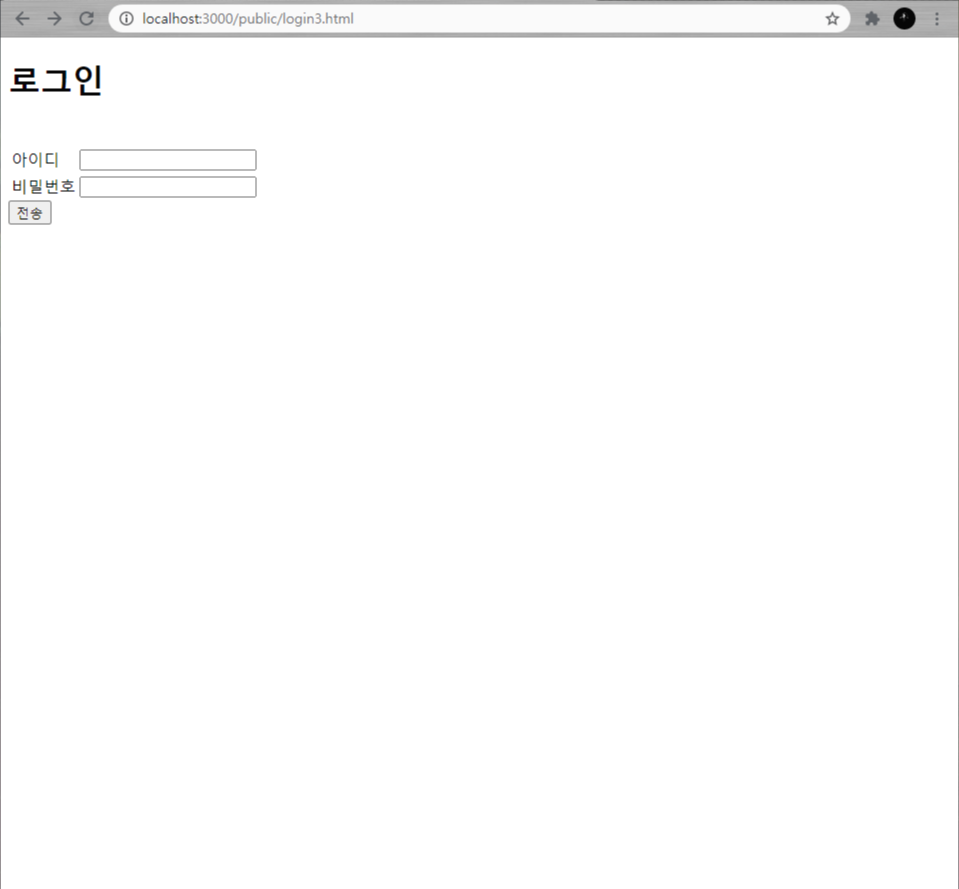 위에서 빨간색으로 표시한 부분이 서로 매칭되어서 처리된다. 정상적으로 처리되는지 확인하기 위해서 app8_02.js 파일을 실행한 후 웹 브라우저에서 login3.html 파일을 연다.