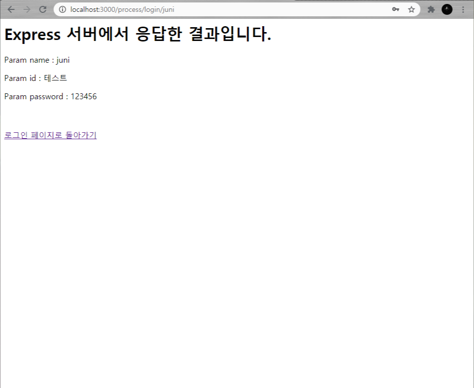 app.post 메소드를 호출할 때 전달하는 첫 번째 파라미터의 값이 /process/login 에서 /process/login/:name 으로 변경되었다. 이것은 /process/login/ 뒤에 오는 값을 파라미터로 처리하겠다는 의미이다.