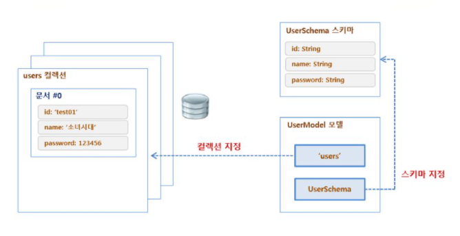 이렇게 모델 객체를 만들면 모델 객체에 지정한 users 라는 이름은 데이터베이스 컬렉션과 매칭되고 UserSchema 객체는 mongoose.Schema() 메소드로 만든 스키마 객체를 가리키게 된다.