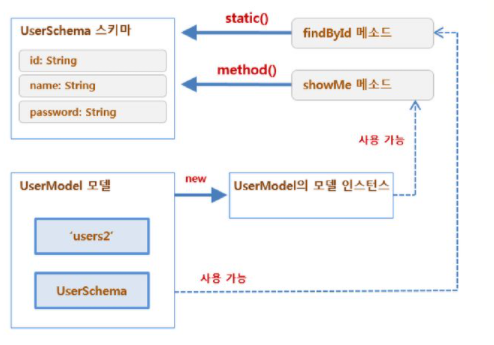 | method(name, fn) | 모델 인스턴스 객체에서 사용할 수 있는 함수를 등록한다. 함수의 이름과 함수 객체를 파라미터로 전달한다. |