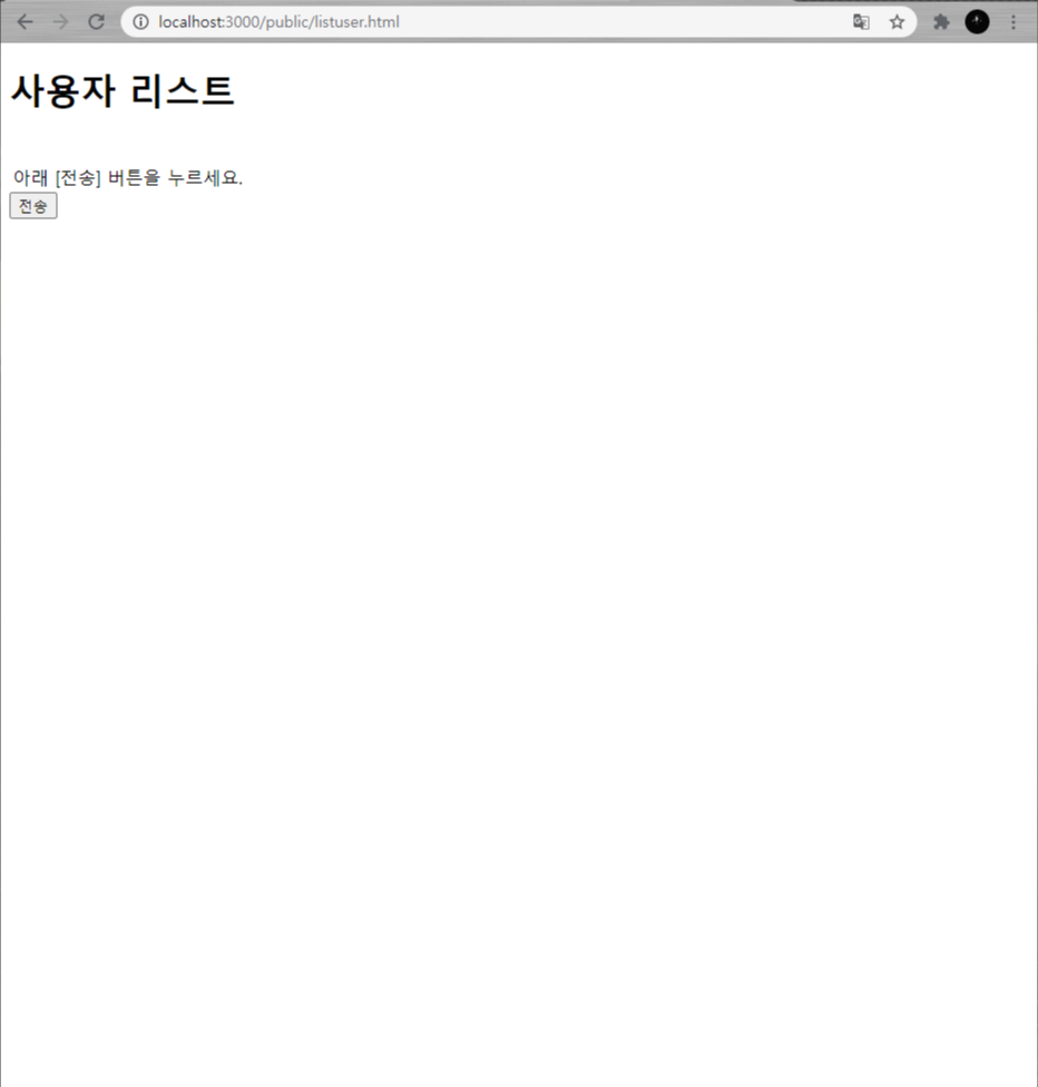 이제 새로 추가한 사용자리스트 기능을 확인해보자. 웹 브라우저에서 localhost:3000/public/listuser.html 사이트에 접속하면 화면을 확인할 수 있다.