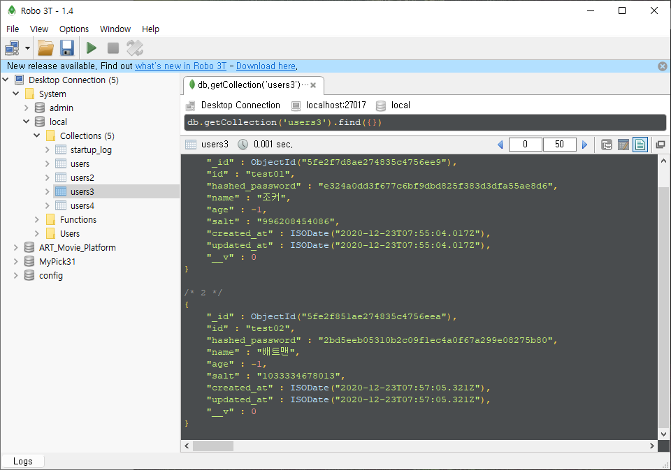 salt 속성에도 값이 들어있는데 이 값은 문서 객체가 저장될 때마다 변경된다. 다시 한 번 웹 브라우저를 열고 로그인 사이트에 접속한다.