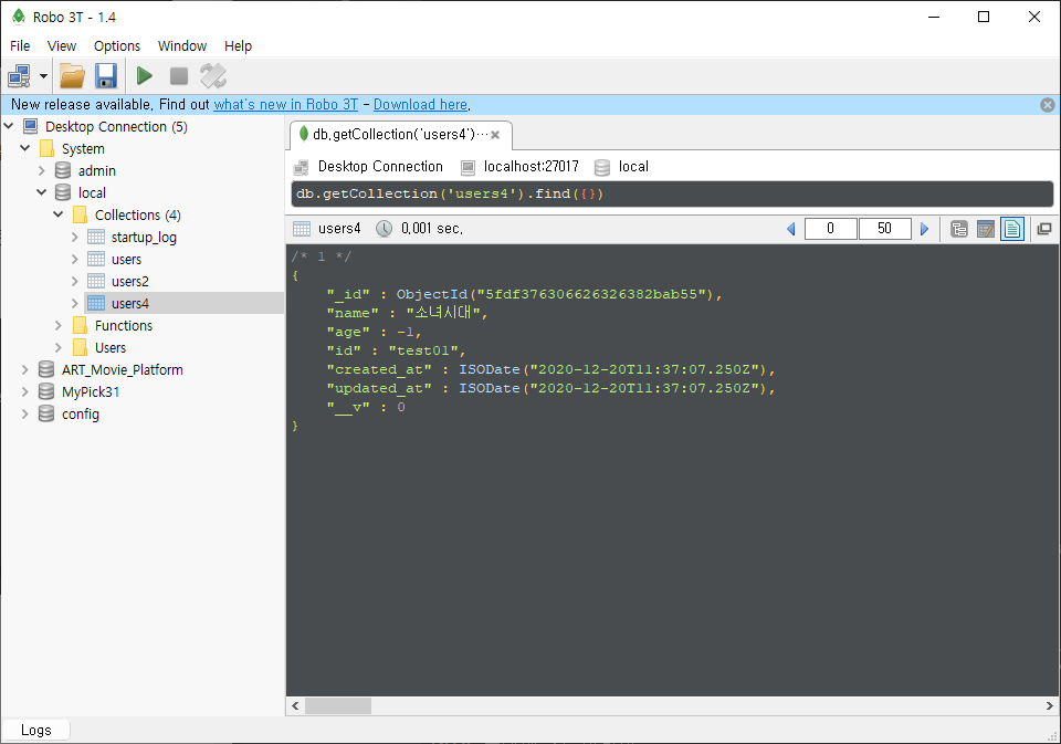 데이터베이스에는 users4 컬렉션으로 문서 데이터를 저장하거나 조회하고 id와 name 속성을 포함하도록 만들것이다.