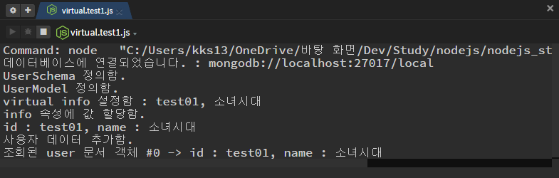 스키마 객체의 virtual() 함수를 사용하는 방법을 알아보기 위해서 프로젝트 폴더 안에 virtual_test1.js 파일을 만든 후 데이터베이스에 문서 객체를 저장하거나 조회하는 코드를 입력한다.