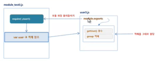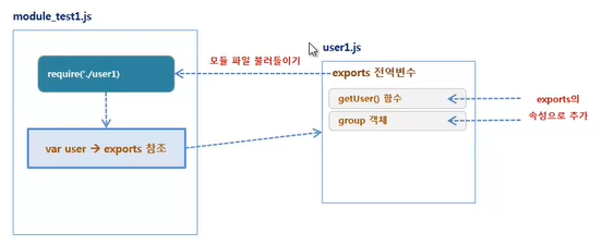 따라서, 속성이 할당된 변수에서는 exports에 추가한 getUser() 함수나 group 객체를 참조하여 사용할 수 있다.