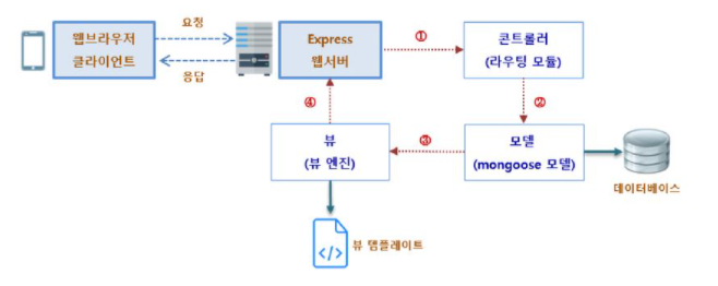 - 웹 브라우저에서 보내온 요청은 웹 서버인 익스프레스에서 컨트롤러로 보낸다.