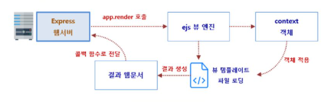뷰 엔진은 뷰 템플릿 파일에서 웹 문서의 기본 형태를 읽어 들여 사용자가 보게 될 최종 웹 문서를 만든 후 클라이언트에 응답을 보낸다.