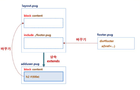 '상속한다' 라는 것은 layout.pug 파일의 내용을 바탕으로 adduser.pug 파일에서 일부 수정한다는 뜻이다.