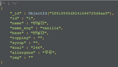 - season / signature DB는, id / name / name_eng / base / topping / syrup / kcal / allergens 로 구성되어있다.