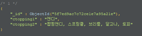 - ctopping 컬렉션에는 큰 카테고리 범주의 topping인 ctopping1과 작은 카테고리 범주의 topping인 ctopping2가 있다.